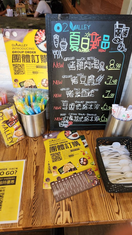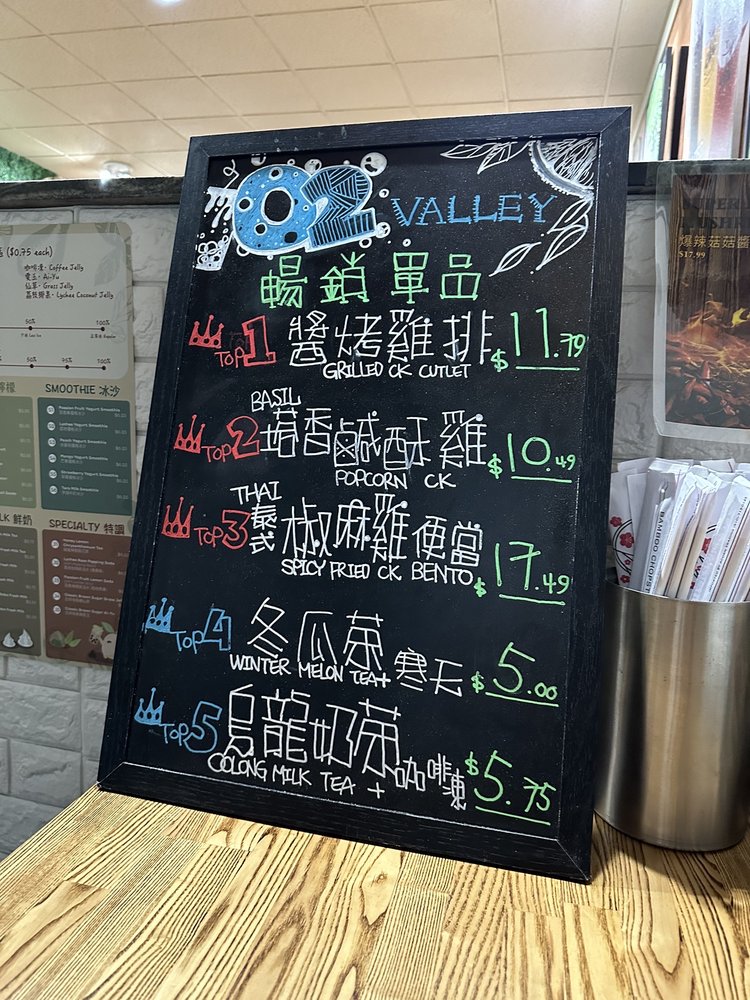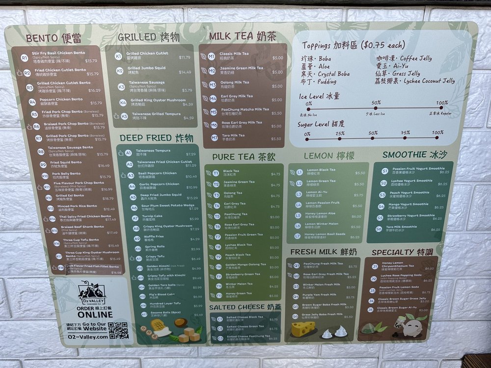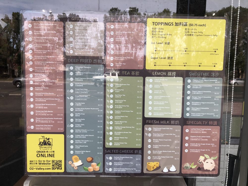 O2 Valley, a Taiwanese Bubble Tea restaurant located in Cupertino, CA, offers a diverse menu with huge portions and affordable prices. Customers rave about the bento boxes, especially the Grilled Chicken Cutlet Bento, which features flavorful chicken, rice, veggies, and sides. The Basil Popcorn Chicken is also a hit for its crispy texture and well-seasoned taste. The menu includes a variety of boba teas, with mixed reviews on the flavors. The restaurant provides quick service, a simple yet calming interior, and options for takeout or dine-in. While some customers mention minor issues like dry pork belly or powdery chicken texture, overall, O2 Valley is praised for its delicious food, ample portions, and great value. It's a go-to spot for satisfying Taiwanese meals in the South Bay area.